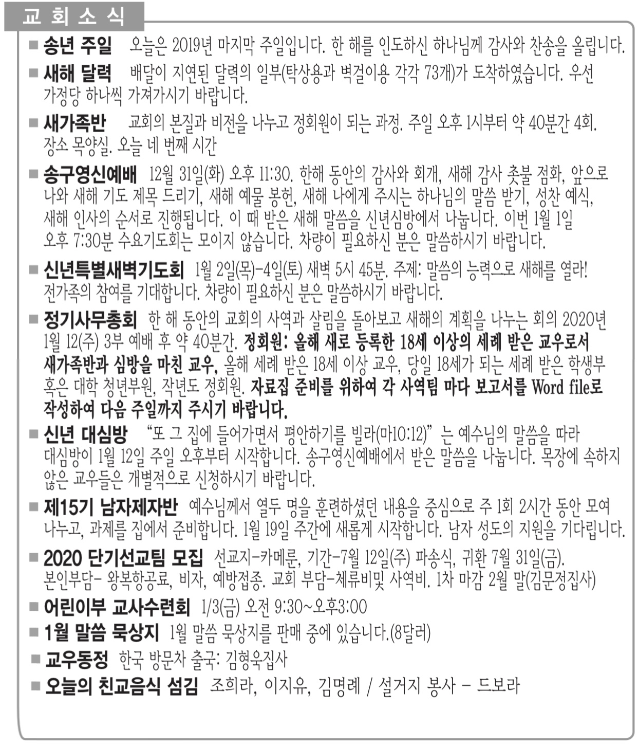 주현절 후 네번째 주일 ■ 목장교회 목장교회가 두 달 동안의 휴식을 마치고 이번 주일 주간부터 모임을 시작하여 6월까지 계속합니다. 목자 목장 모임도…